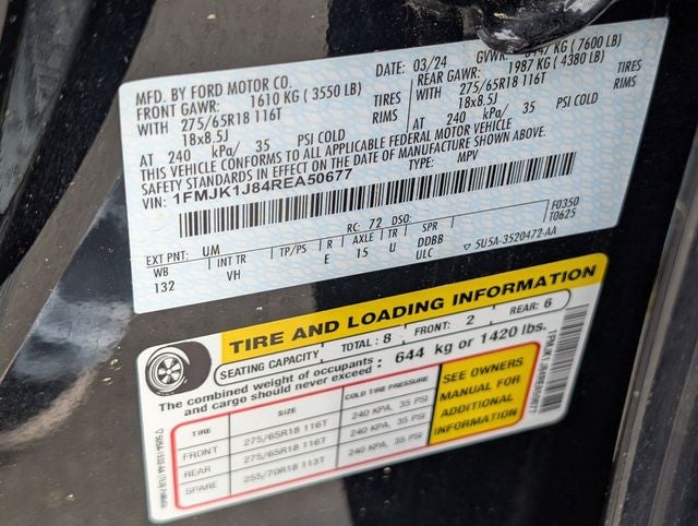 Well equipped with: Equipment Group 202A High Package (110V/150W AC Power Outlet, 2nd Row Power-Folding Captain's Chairs, 3rd Row Vinyl Power-Folding Head Restraints, 4-Door Intelligent Access (Lock/Unlock), Accent Color Painted Rear Bumper, ActiveX-Trimmed 1st & 2nd Row Seats, Advanced Security Pack, Ambient Lighting, Heated Steering Wheel, Heated/Ventilated Front Seats, Power Liftgate, Power Tilt/Telescopic Steering Wheel w/Memory, Power-Adjustable Pedals w/Memory, Power-Folding Sideview Mirrors w/Autofold, Remote Start, SecuriCode Keyless Entry Keypad, and Wireless Charging Pad), 18 Machined-Face Aluminum Wheels, 2nd Row Power-Folding 40/20/40 ActiveX Bench Seat, 3.31 Axle Ratio, 3rd row seats: split-bench, 4-Wheel Disc Brakes, 6 Speakers, ABS brakes, Air Conditioning, Alloy wheels, AM/FM radio: SiriusXM with 360L, Auto High-beam Headlights, Auto-dimming Rear-View mirror, Automatic temperature control, Brake assist, Bumpers: body-color, Cloth Front Captain's Chairs, Compass, Delay-off headlights, Driver door bin, Driver vanity mirror, Dual front impact airbags, Dual front side impact airbags, Electronic Stability Control, Emergency communication system: SYNC 4 911 Assist, Exterior Parking Camera Rear, Four wheel independent suspension, Front anti-roll bar, Front Bucket Seats, Front Center Armrest, Front dual zone A/C, Front reading lights, Fully automatic headlights, Garage door transmitter, Heated door mirrors, Illuminated entry, Leather steering wheel, Low tire pressure warning, Navigation system: Connected Navigation, Occupant sensing airbag, Outside temperature display, Overhead airbag, Overhead console, Panic alarm, Passenger door bin, Passenger vanity mirror, Power door mirrors, Power driver seat, Power steering, Power windows, Radio data system, Radio: AM/FM Stereo w/MP3 Capable, Rear air conditioning, Rear anti-roll bar, Rear reading lights, Rear window defroster, Rear window wiper, Reclining 3rd row seat, Remote keyless entry, Security system, SiriusXM w/360L, Speed control, Speed-sensing steering, Speed-Sensitive Wipers, Split folding rear seat, Spoiler, Steering wheel mounted audio controls, SYNC 4 w/Enhanced Voice Recognition, Tachometer, Telescoping steering wheel, Tilt steering wheel, Traction control, Trip computer, Variably intermittent wipers, and Voltmeter.